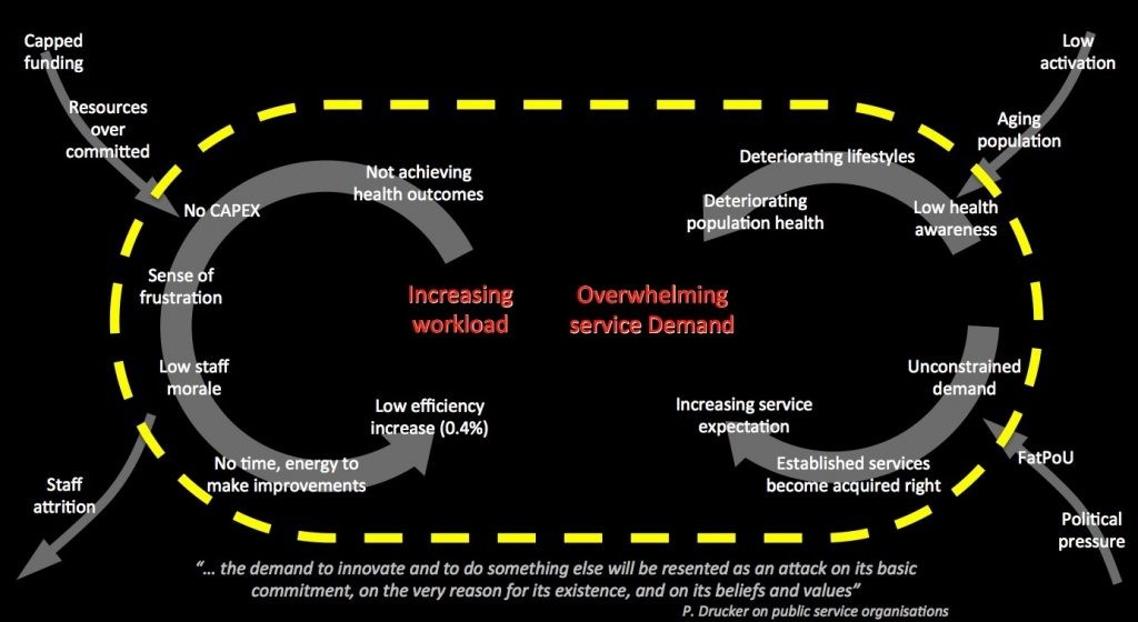 DHS have analysed the challenge facing health and social care and is summarised it in a “goggles” diagram above. Internal challenges conflated by patient expectations create an unsustainable service environment.